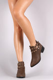 These modernized western booties feature an almond toe silhouette, front studs detail, double ankle strap with side buckles, and blocky stacked heel. Finished with a lightly padded insole and rear zip-up closure for easy on/off.