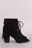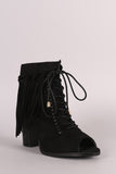 These chic fringe detail, whip stitching accents, and chunky stacked heel. Finished with lightly cushioned insole and side zipper closure for easy on/off.