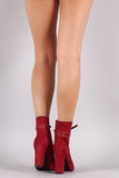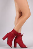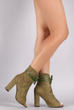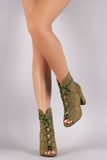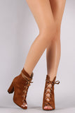 These striking ankle boots feature a peep toe silhouette, vegan leather lace-up closure, and chunky wrapped heel. Finished with a cushioned insole for comfort.