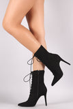 These trendy booties feature a pointy toe silhouette, front lace-up design, and wrapped stiletto heel. Finished with a cushioned insole and side zipper closure.