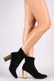 These stylish booties feature a pointy toe silhouette, slightly stretched crushed velvet, and chunky metallic heel. Finished with a cushioned insole and pull-on construction.