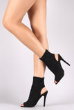 These on-trend booties feature a woven detailing at front vamp, peep toe silhouette, stitching accents, and wrapped stiletto heel. Finished with an exposed back and cushioned insole for comfort.