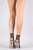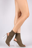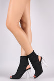 These fashionable booties feature a slightly stretched elastane fabric, peep toe, and back cutout design. Finished with a lightly padded insole and chunky perspex heel.