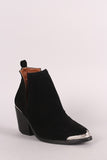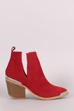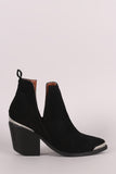 These western inspired booties feature a pointy toe silhouette, embossed metal rand, side cutout design, and chunky stacked heel. Finished with a cushioned insole and easy pull-on construction.