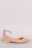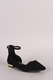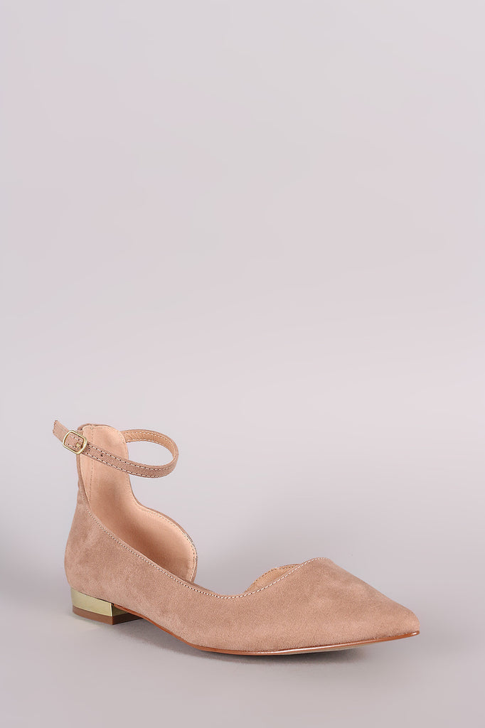 This pretty ballet flat features a pointy toe silhouette, thin ankle strap with adjustable buckle closure, and side cutout detail. Finished with a slight metallic accent heel and lightly padded insole.