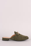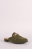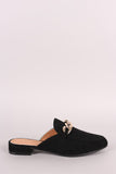 This menswear inspired loafer flat features a vegan suede upper with seamed paneling, open back design, and bold shiny chain link accent across arch. Finished with a low block heel and lightly cushioned insole.