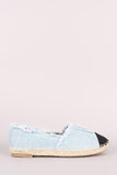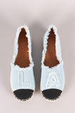 This chic loafer flat features a contrast toe cap with NY or LA patch design, denim upper with frayed detail, braided espadrille accent along the midsole, and cushioned insole for comfort.