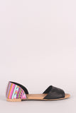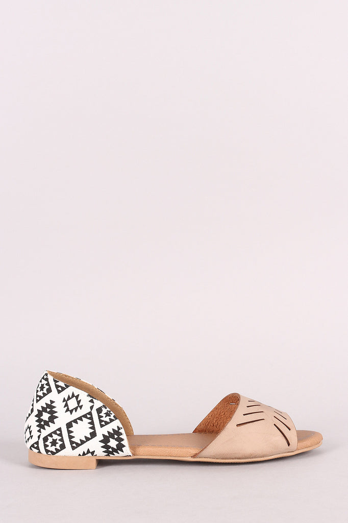 This stylish peep toe flat features a geometric cutout design, open shanks, and tribal printed canvas back. Finished with a lightly padded insole and easy slip on construction.