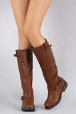 This knee high boot features a studded detail along the back panel, round toe, double buckle strap design, stitching accents, and low heel. Finished with a cushioned insole, soft interior lining, and rear zipper closure for easy on/off.