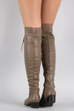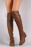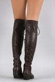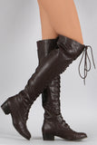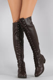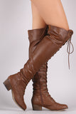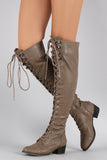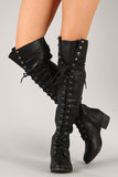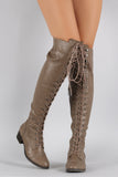 These over-the-knee boots feature a round toe front, low heel, lace up closure at front shaft, and partial side zip for easy on/off. Finished with smooth interior lining and cushioned insole for comfort.
