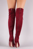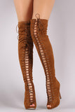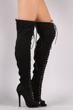 These striking over the knee boots feature a peep toe silhouette, lace up front design, low platform, and wrapped stiletto heel. Finished with cushioned insole, smooth lining, and full-length rear zipper closure.