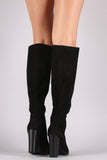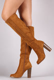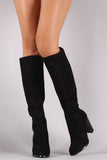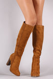 These knee high boots feature a soft vegan suede with perforation design at side, round toe silhouette, and chunky stacked heel. Finished with a cushioned insole, smooth lining, and full-length side zipper closure for easy on/off.