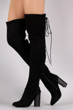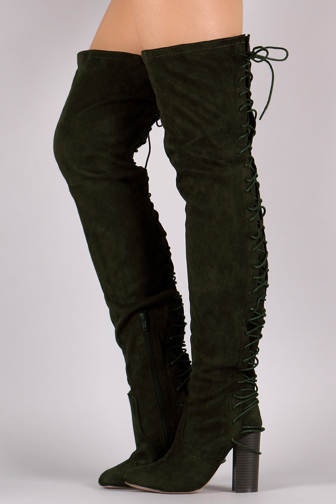 These chic over-the-knee boots feature an almond toe silhouette, back corset lace-up construction, and stacked chunky heel. Lightly cushioned insole and partial size zipper closure.