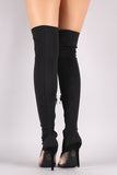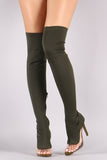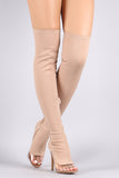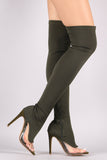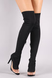 These over-the-knee boots feature a peep toe silhouette, clear lucite inset, fitted elastane shaft, and stiletto heel. Finished with a cushioned insole and partial side zip closure.