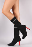 These cozy boots feature a stretchy ribbed knit fabrication with stripe detail, almond toe silhouette, and contrast oval heel. Finished with a cushioned insole and pull-on construction.