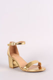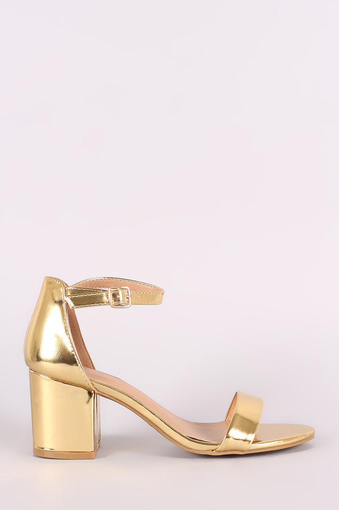 This open toe heel features a single band across vamp, blocky wrapped heel, lightly padded insole, and adjustable ankle strap with buckle closure. Finished with a mirror-shine design.