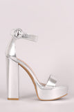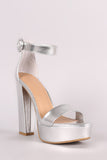 This platform heel features an open toe silhouette, metallic design, adjustable ankle strap with buckle fastening, chunky heel, and a lightly padded insole for comfort.