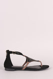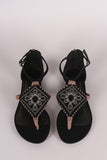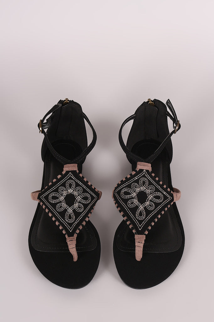This delightful flat sandal features a diamond-shape vamp with embroidery design, whip stitching accents, side buckle detail, and lightly padded insole for comfort. Rear zip closure.