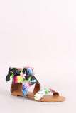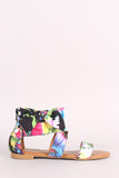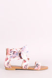 This pretty flat sandal features a floral/abstract print fabric upper, crisscross vamp strap, ankle strap with side bow detail, and open toe design. Finished with a lightly padded insole, enclosed back, and rear zipper closure for easy on/off.