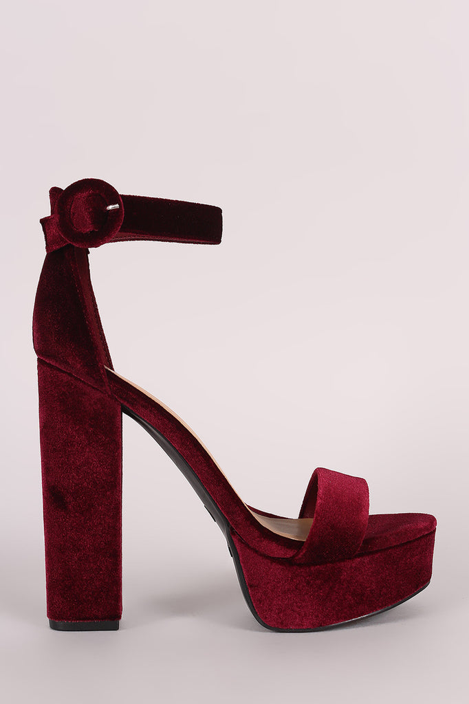 This retro inspired open toe heel features a soft velvet upper, one band across vamp, covered platform, and adjustable ankle strap with buckle closure. Finished with a lightly padded insole and chunky wrapped heel.
