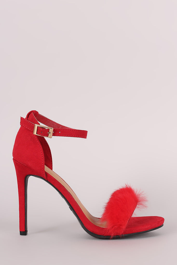This beautiful open toe heel features a soft faux fur accent band across vamp, adjustable ankle strap with buckle fastening, wrapped stiletto heel, and lightly padded insole.
