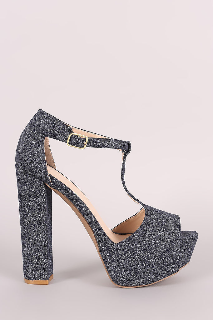 This lovely heel features a t-strap construction, peep toe silhouette, and an adjustable ankle strap with buckle fastening. Finished with a covered platform and chunky wrapped heel. Lightly padded insole for comfort.