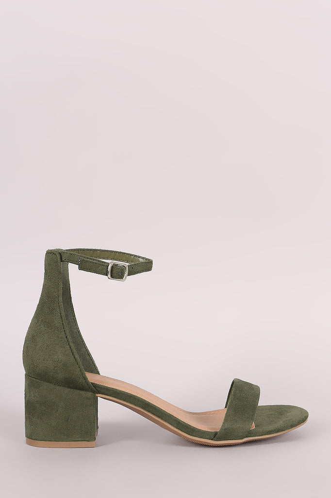 This open toe heel features a single band across vamp, blocky wrapped heel, lightly padded insole, and adjustable ankle strap with buckle closure.