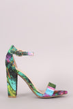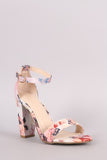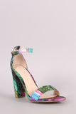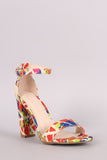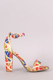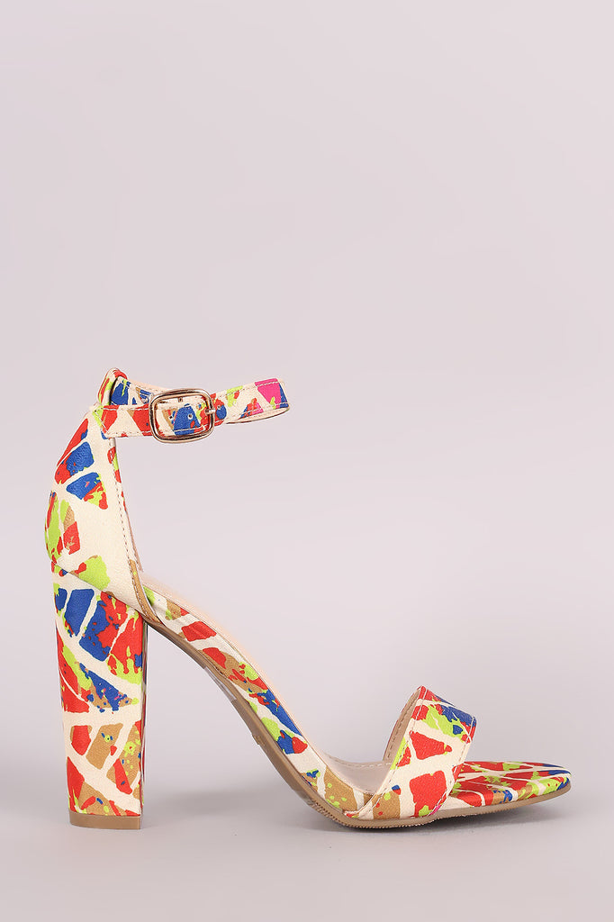 This lovely heel features an abstract print fabric, open toe silhouette, one band across vamp, and chunky heel. Finished with a lightly padded insole and adjustable ankle strap with buckle closure.