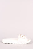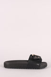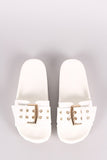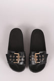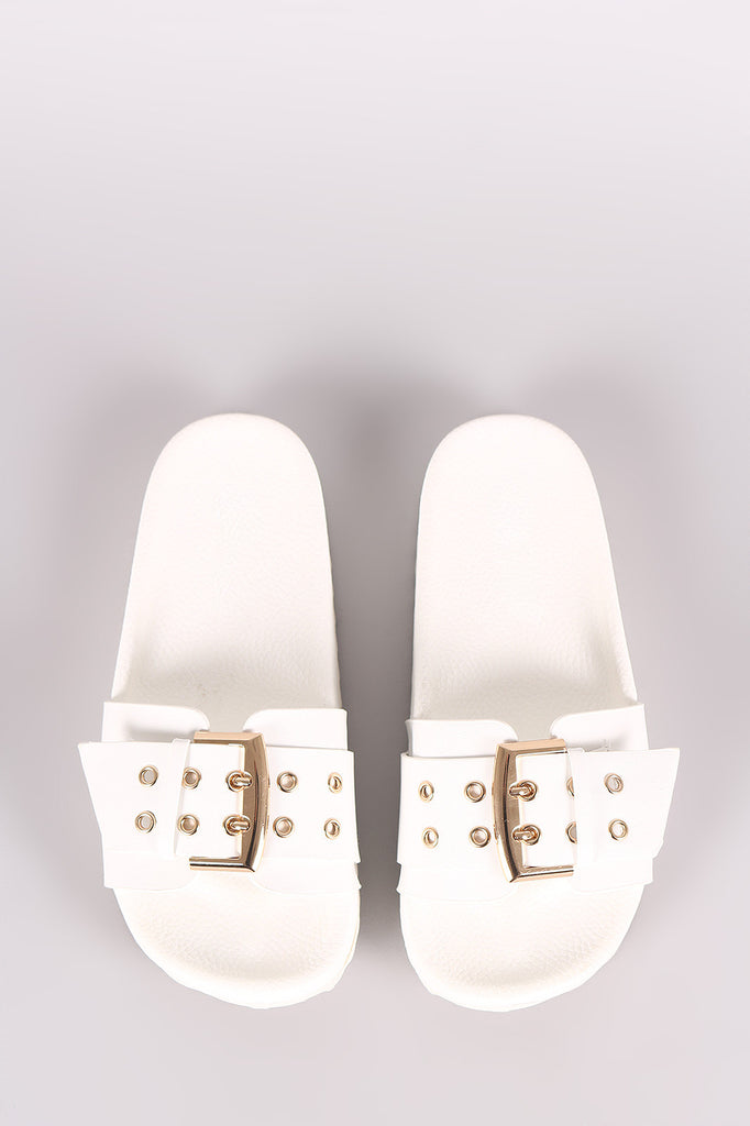 This slide sandal features an oversized buckle accent with doubled rows of grommets for an adjustable fit. Finished with a molded footbed and a ridged sole. Easy slip-on style.