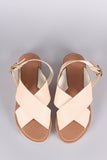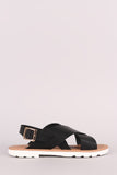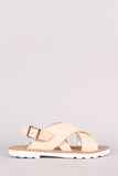 This comfy flat sandal features an open toe silhouette, crisscrossing vamp straps, adjustable slingback strap with buckle closure, and lug platform sole. Finished with a lightly padded insole.