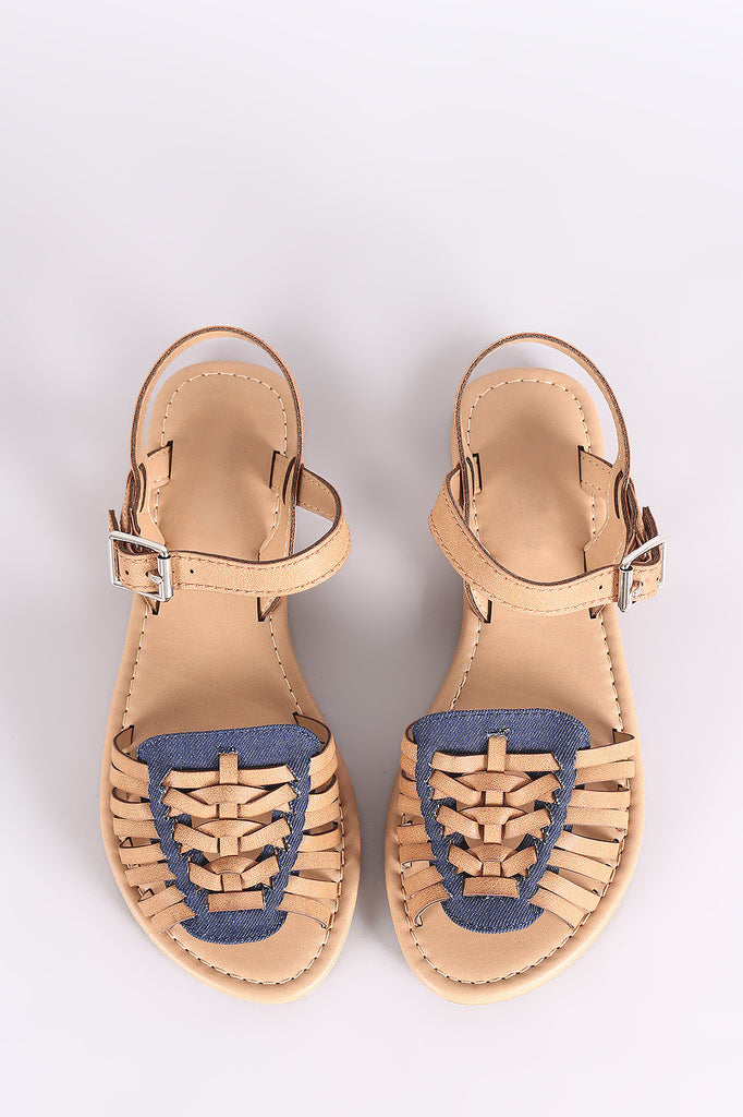 Soda Woven Denim Peep Toe Ankle Strap Flat Sandal