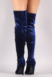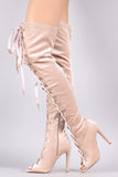 These over-the-knee boots feature a peep toe silhouette, d-ring with corset style lace-up design, side partial zipper closure, a lightly cushioned insole and wrapped stiletto heel.