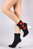 These alluring booties feature an almond toe silhouette, vegan suede upper with beautiful floral embroidery design, and chunky perspex heel. Finished with a cushioned insole and convenient side zip closure.