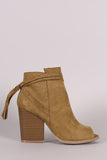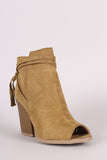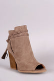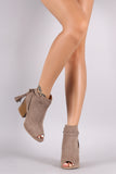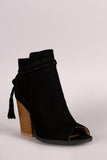 These booties are peep toe silhouette, featuring a decor wrap along the ankle with a fringe tassel end. Lightly padded lining. Finished on a stacked heel.