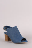 This stylish heel features a denim upper with center seam detail, peep toe silhouette, and chunky stacked heel. Finished with a lightly padded insole and adjustable slingback strap with buckle fastening.