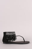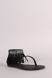 Bamboo Suede Embroidered Fringe Cuff T-Strap Flat Sandal