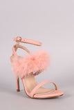 This gorgeous heel features an instep strap with delicate feather accent, open toe silhouette, wrapped stiletto heel, and adjustable ankle strap with buckle fastening. Lightly padded insole for comfort.