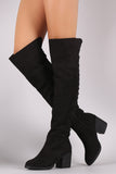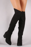 These over the knee boots , feature a decor lace up design on the back with a self tie drawstring. Partial inner adjustable side zipper. Light faux fur lining. Slight almond toe. Finished on a chunky stacked heel.