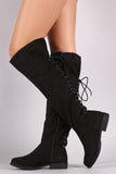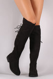 These knee high boots feature faux suede, round toe, lace up back, flat heel, and partial inner side zipper for easy on/off. Finished with faux fur lining and lightly padded insole.