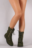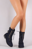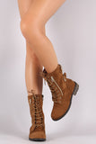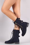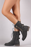 These edgy boots feature a round toe silhouette, decorative zipper trim, double buckles accent, and low block heel. Finished with a cushioned insole, smooth lining, and lace up closure.