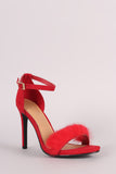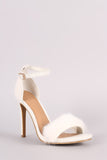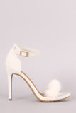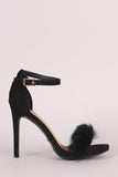 This beautiful open toe heel features a soft faux fur accent band across vamp, adjustable ankle strap with buckle fastening, wrapped stiletto heel, and lightly padded insole.