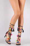 These chic open toe heels feature an embroidered strappy silhouette, decorative colorful pom pom accent, lightly padded insole, and wrapped stiletto heel. Finished with an adjustable tassel lace up design and back zip closure.