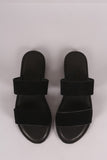 This slide sandal features an open toe silhouette, double wide bands across vamp, and lightly padded insole.