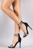 This lovely heel features an open toe silhouette, pearls/studs embellished ankle cuff, single band at front vamp, slight platform, and wrapped stiletto heel. Finished with a lightly padded insole and rear zipper closure for easy on/off.