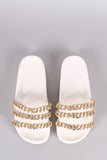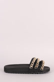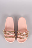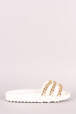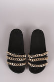 These slide sandals feature pebbled faux leather, three vamp straps with chain accent, lug sole, and molded footbed. Easy slip on style.
