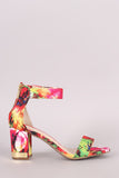 This alluring open toe heel features an abstract watercolor print, one band across vamp, ankle strap, and metallic accent chunky heel. Finished with a lightly padded insole and rear zipper closure.
