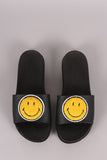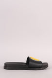 This chic sandal features an open toe silhouette and wide band across vamp with assorted emoji patches design. Easy slide style.