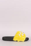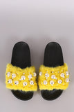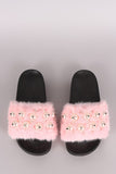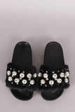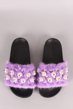 This chic slide sandal features a soft faux fur band with multi-size pearly beads accent and molded footbed. Easy slip-on style.