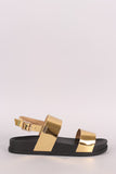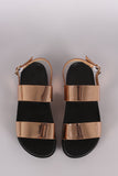 This flat sandal is on a cushioned footbed, features two wide straps across the vamp and an adjustable slingback strap. Metallic design.