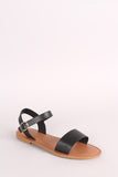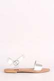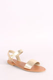 This flat sandal features a single band across vamp, lightly padded insole, and adjustable ankle strap with side buckle closure.